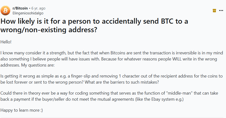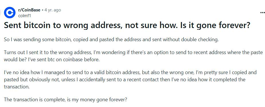 A user on r/CoinBase describes accidentally sending BTC via copy-paste to an unintended address, and discovered too late that the funds are irretrievable: