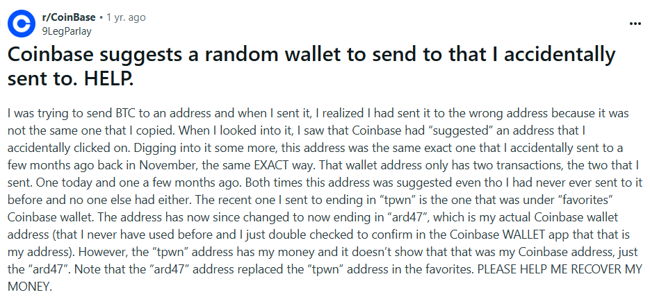 “Coinbase suggests a random wallet … I accidentally clicked on. … That wallet address has my money, and it doesn’t show that that was my Coinbase address.”