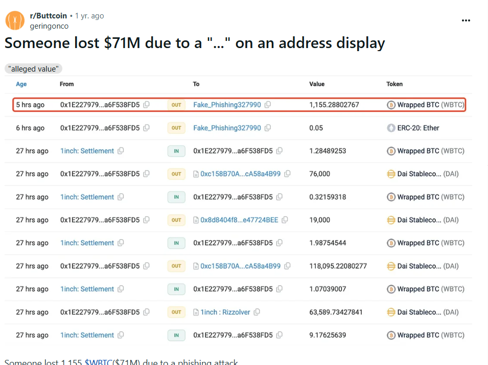 “Someone lost 1,155 $WBTC ($71 M) … two addresses have the same starting and ending letters … wallets hide the middle part with ‘…’.”