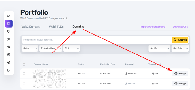 Portfolio → Domains → Manage → DNS - Add the A record: